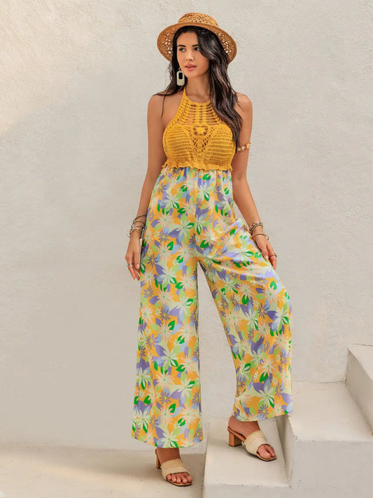 أُوكَازيُونOpenwork Halter Neck Floral Wide Leg Jumpsuit