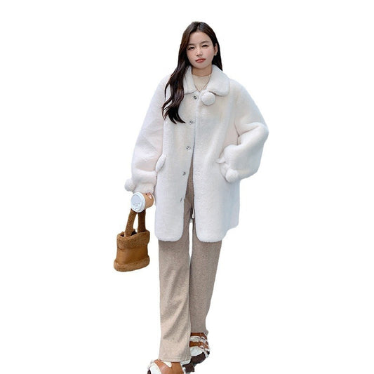 Peter Pan Collar Loose Mid-length Single-breasted Milky White Plush Coat
