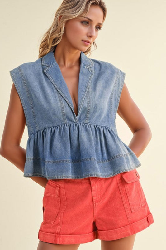 أُوكَازيُونLapel Collar Peplum Denim Top