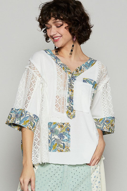 POL Vintage Washed Lace Patchwork Printed Half Button Top