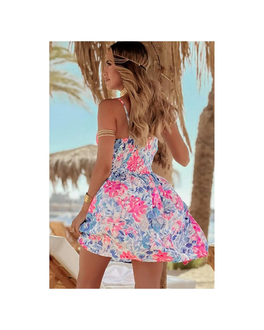 Sky Blue Floral Spaghetti Strap Surplice Neck Shirred Waist Mini Dress - M