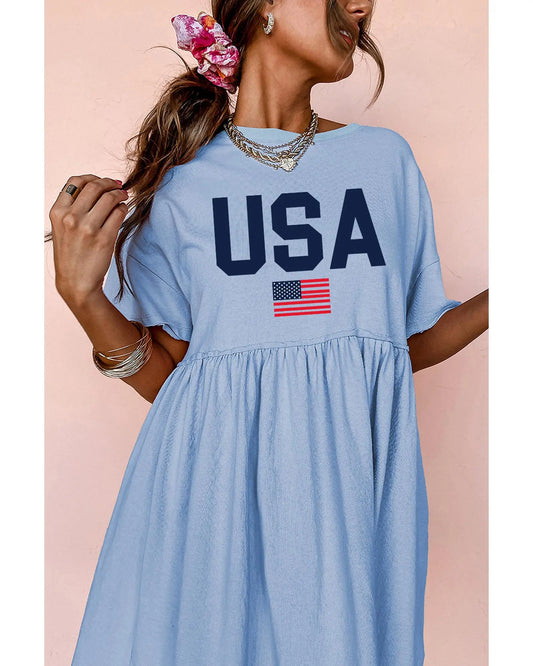 Sky Blue USA Flag Print Short Sleeve High Waist Babydoll Dress - S