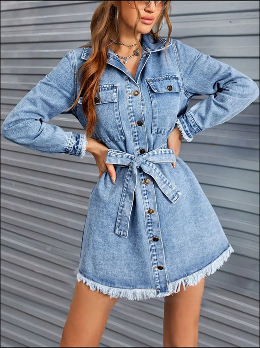 Raw Hem Collared Neck Long Sleeve Denim Dress