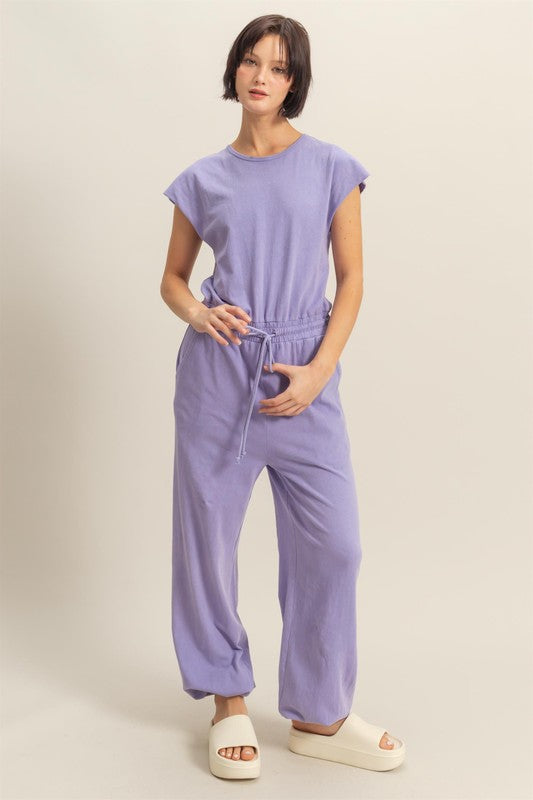 HYFVE Back Keyhole Round Neck Cap Sleeve Drawstring Jumpsuit