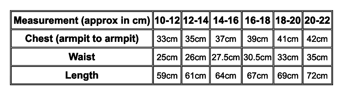 Chest (armpit to armpit) | 33cm | 35cm | 37cm | 39cm | 41cm | 42cm |